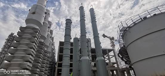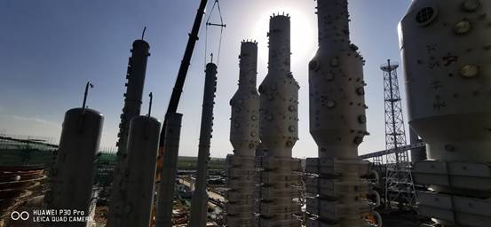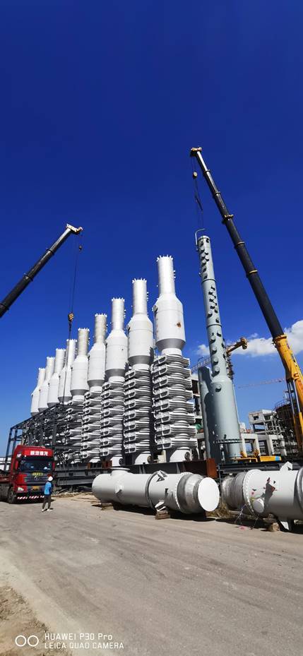 七月的驕陽似火,興華科技公司聯(lián)堿現(xiàn)場的設備安裝也正在經受這盛夏的考驗,炎熱的天氣,擋不住興華科技員工的工作熱情,經過前期的精心準備,由三門峽化機制造的聯(lián)堿大型塔器碳化尾氣凈氨塔、濾過尾氣洗滌塔、濾過尾氣凈氨塔、和淡液蒸餾塔以及煅燒爐氣洗滌塔等塔陸續(xù)進廠,經過相關部門領導的統(tǒng)籌協(xié)調,分兩次將7臺大型塔器全部安全吊裝到位,至此聯(lián)堿重堿現(xiàn)場的所有塔器全部安裝完成,為下一步的管道安裝打下了堅實的基礎。